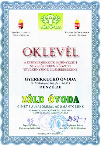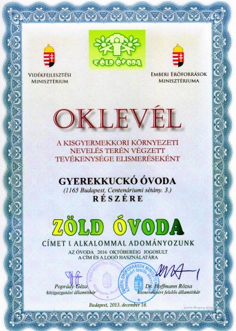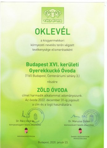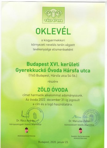 2020-ban Óvodánk harmadik alkalommal nyerte el a Zöld Óvoda minősített címet.